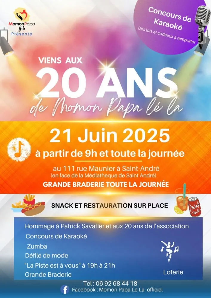 L’association réunionnaise « Momon Papa Lé La » célèbre cette année ses 20 ans d’engagement auprès des familles de l’île. Pour marquer cet anniversaire, une grande journée festive est organisée le samedi 21 juin 2025 au 111 rue Maunier, en face de la Médiathèque à Saint-André.