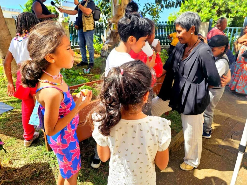 Entourée de la Maire Ericka Bareigts, d’élus de quartier, des membres de l’association, des enfants et des riverains, Linda Narcisse, présidente de l’Association Renaissance, a présenté les objectifs de ce jardin partagé.