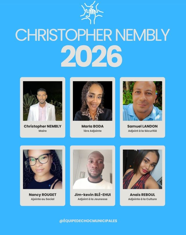 A Saint-Benoit : Sabrina Ramin (avec le soutien du RN) ; Patrice Dalleau ; Jean-Hugues Ratenon, Philippe Admeth (ancien DGS de Sainte-Rose viré par Vergoz, aujourd’hui employé par la mairie de Saint-Joseph) ; Christopher Nembly (jeune entrepreneur qui a déjà nommé ses adjoints, alors que l’élection n’a pas encore eu lieu). Ah la jeunesse ! (voir photo ci-dessous). Quant au maire sortant, Patrice Selly (Banian), il officialise sa candidature ce dimanche 26 octobre à Sainte-Anne.