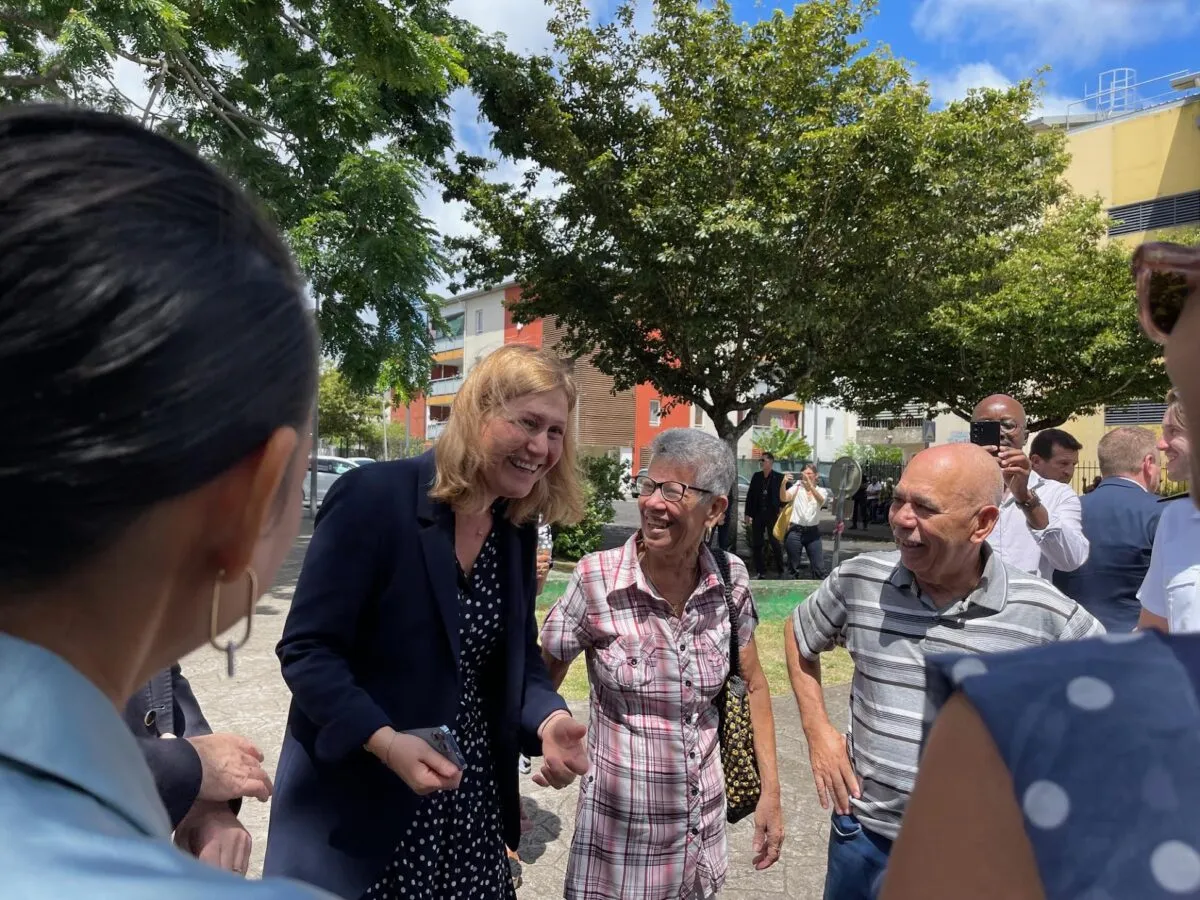 Yaël Braun-Pivet, ici en compagnie de la nounou réunionnaise de ses enfants. C’était lors d’une visite de la présidente de l’Assemblée nationale à Fayard à Saint-André. (Crédit photo : YM)