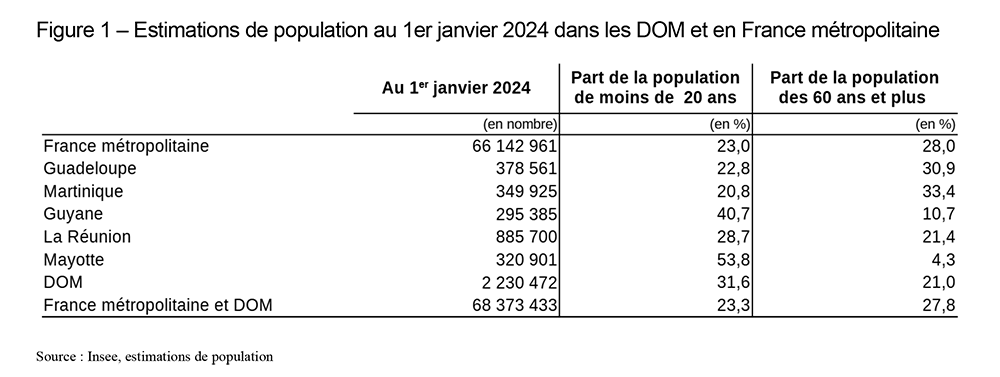 Même si elle vieillit, la population réunionnaise demeure jeune. Ainsi, en 2024, les moins de 20 ans représentent 29 % de la population et les plus de 60 ans, 21 %.