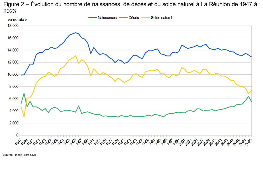 Le solde naturel, différence entre le nombre de naissances et de décès, atteint +7 390, en recul par rapport en 2019 (figure 2). Il s’agit du niveau le plus faible depuis 1950, à l’exception de l’année 2022, marquée par un nombre élevé de décès.