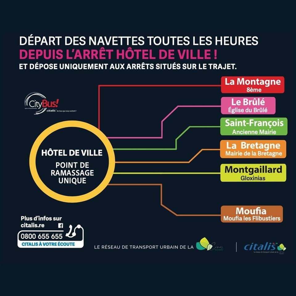 À l’occasion du Marché de Nuit, CityBus facilite vos déplacements en mettant à disposition des navettes régulières au départ de l’arrêt unique situé à l’Hôtel de Ville. Ces navettes partent toutes les heures, permettant un accès simple et direct aux divers quartiers de Saint-Denis.