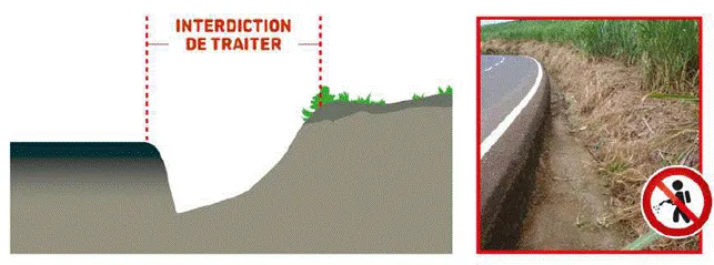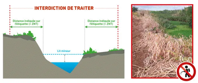 · sur les points d’eau : pas d’application directe de produit et respect d’une distance minimale indiquée sur l’arrêté préfectoral et rappelé sur l’étiquette du produit, s’appliquant de part et d’autre du point d’eau, même à sec (souvent 20 m pour les produits les plus utilisés à La Réunion).