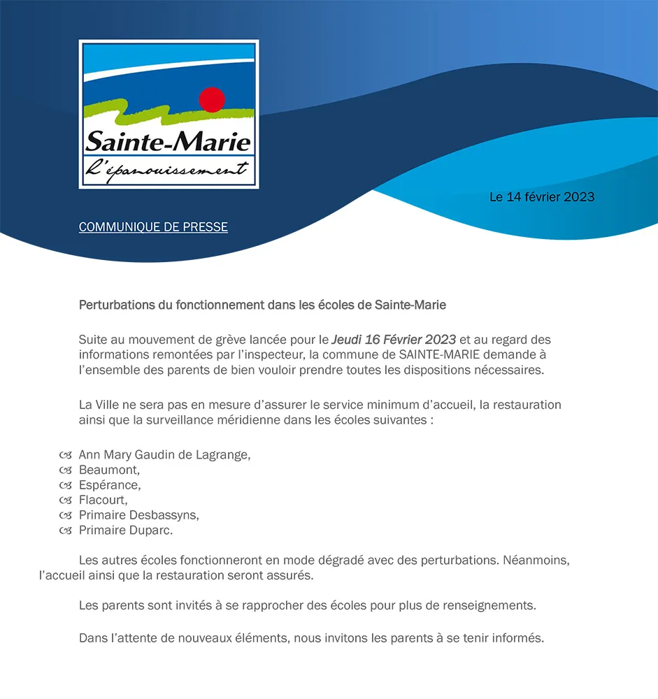 Grève du jeudi 16 février : des perturbations à prévoir dans les écoles de St-Denis