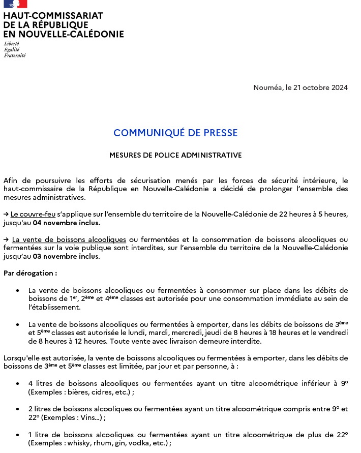 Le Haut-Commissariat de la République en Nouvelle-Calédonie a annoncé ce lundi 21 octobre la prolongation du couvre-feu en vigueur depuis le 17 mai. Cette mesure, instaurée pour répondre à des troubles civils sans précédent, interdit la circulation sur l’ensemble du territoire entre 22 heures et 5 heures du matin et sera maintenue jusqu’au 4 novembre inclus.