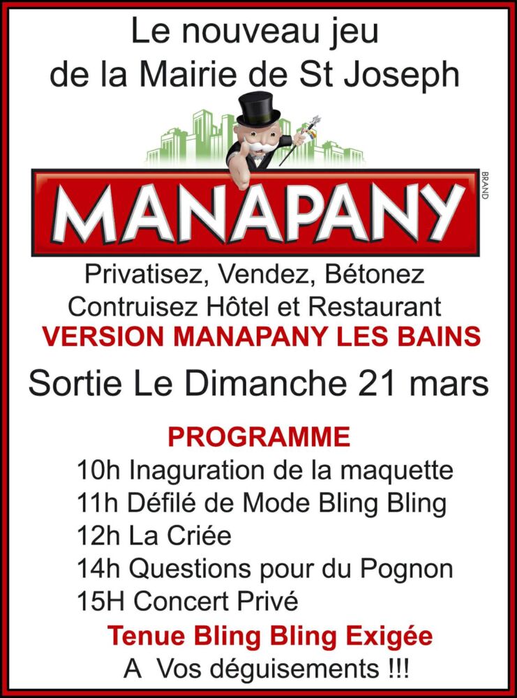 « Monsieur Lebreton et son Conseil Municipal usent et abusent des même stratagèmes que ceux de Monsieur Fontaine à Saint Pierre pour flatter son électorat : projets grandioses à base de béton, de goudron et de bûcherons, de massacres et de privatisation de biens communs, du vivre ensemble et de l’environnement, qui sont pourtant les vraies richesses à préserver de la Réunion pour nos enfants, explique le collectif, qui explique que ce dimanche 21 mars, nous voulons aussi en rire : Manapany, 2025, goudron, monolithe de béton, gros sous, casino, gros zozos, bling-bling et gros loto! »