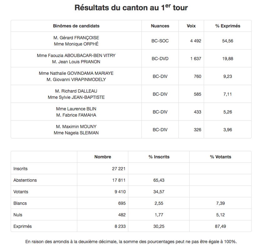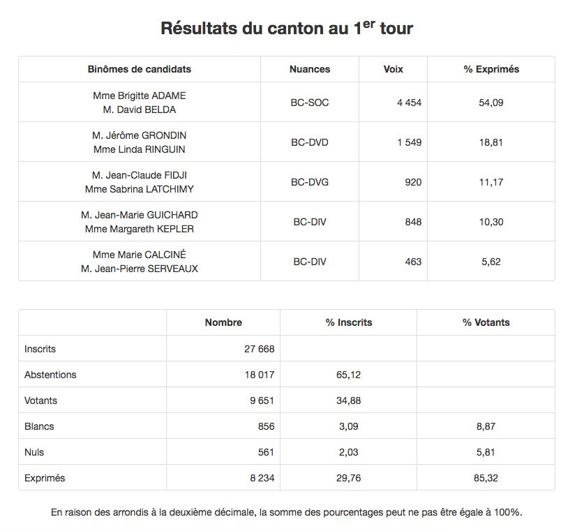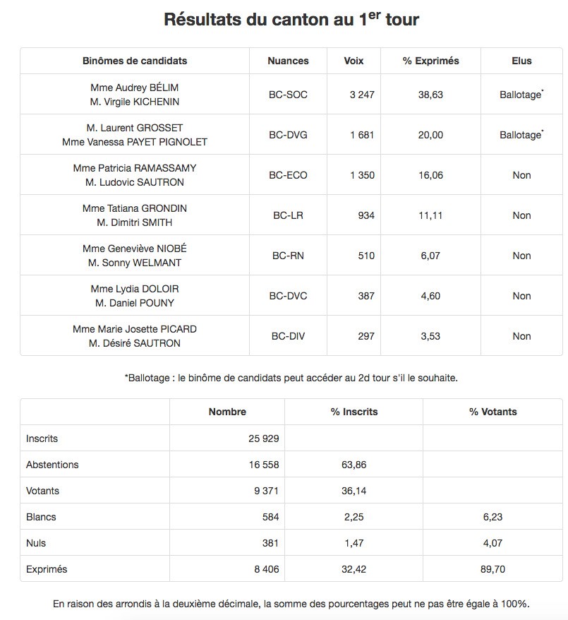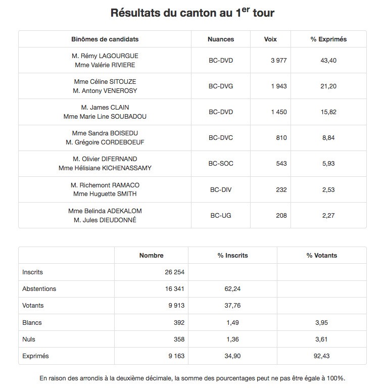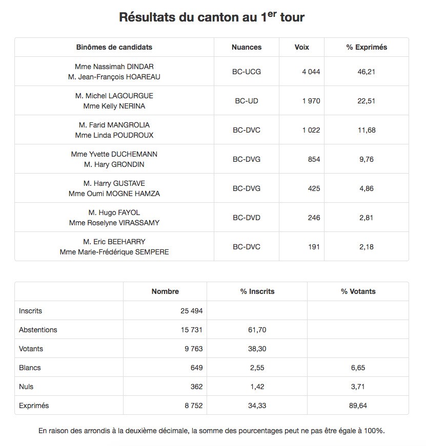 Ces derniers, dans une démarche de désistement républicain, se rangeront derrière les candidats les mieux placés pour battre les binômes socialistes. Ainsi, sur la première circonscription, ce sont Michel Lagourgue et Kelly Nérina qui tenteront de déloger Nassimah Dindar sur le Canton 10.
