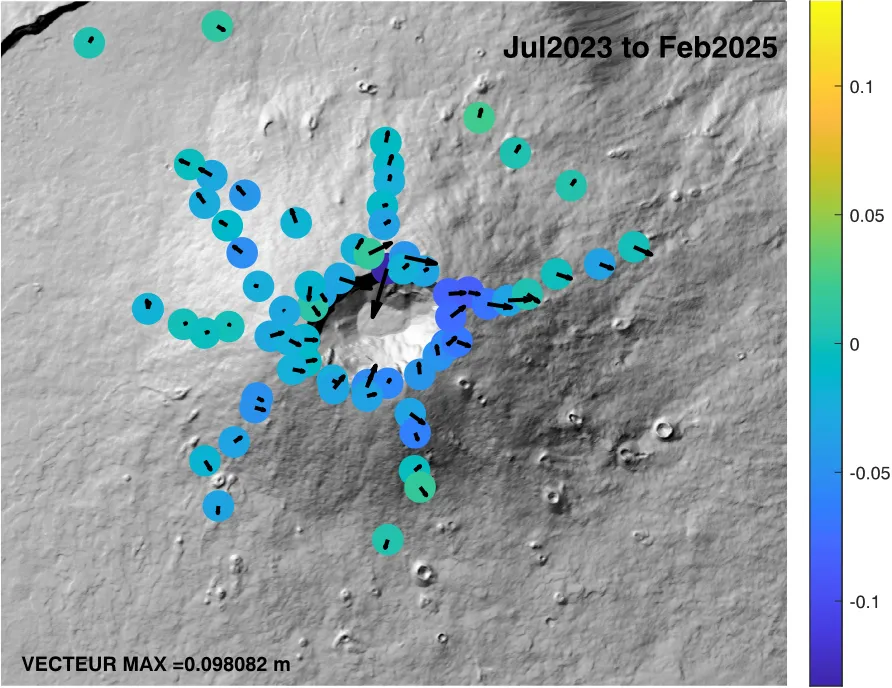 Entre février et mars 2025, les équipes de l’Observatoire Volcanologique du Piton de la Fournaise (OVPF) ont réalisé plusieurs campagnes de terrain afin de re-mesurer les positions de 70 points situés sur l’ensemble du cône terminal du volcan. Ces nouvelles mesures ont révélé une subsidence cumulée variant de 2 à 13 cm selon les secteurs, une tendance qui s’inscrit dans le cadre des phases de repos habituelles du volcan. Les données récoltées montrent ainsi une dynamique géologique importante à prendre en compte pour la surveillance de cette zone.
