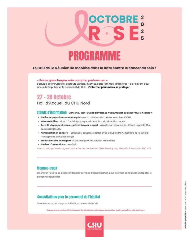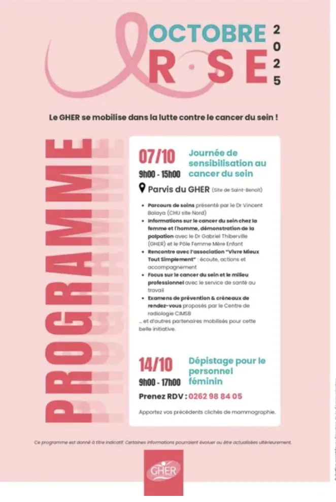 Dès le 7 octobre, le GHER lance le mouvement sur le parvis de son site de Saint-Benoît avec une grande journée de sensibilisation. Médecins, soignants et associations locales y présenteront le parcours de soins, des démonstrations d’autopalpation et des informations adaptées aussi bien aux femmes qu’aux hommes. Des créneaux d’examens préventifs et des rendez-vous de dépistage seront proposés, en partenariat avec le Centre de radiologie CIMSB. L’association “Vivre Mieux Tout Simplement” sera également présente pour écouter et accompagner les familles.