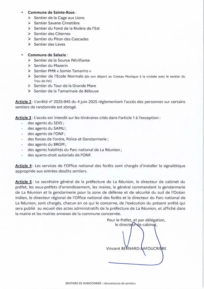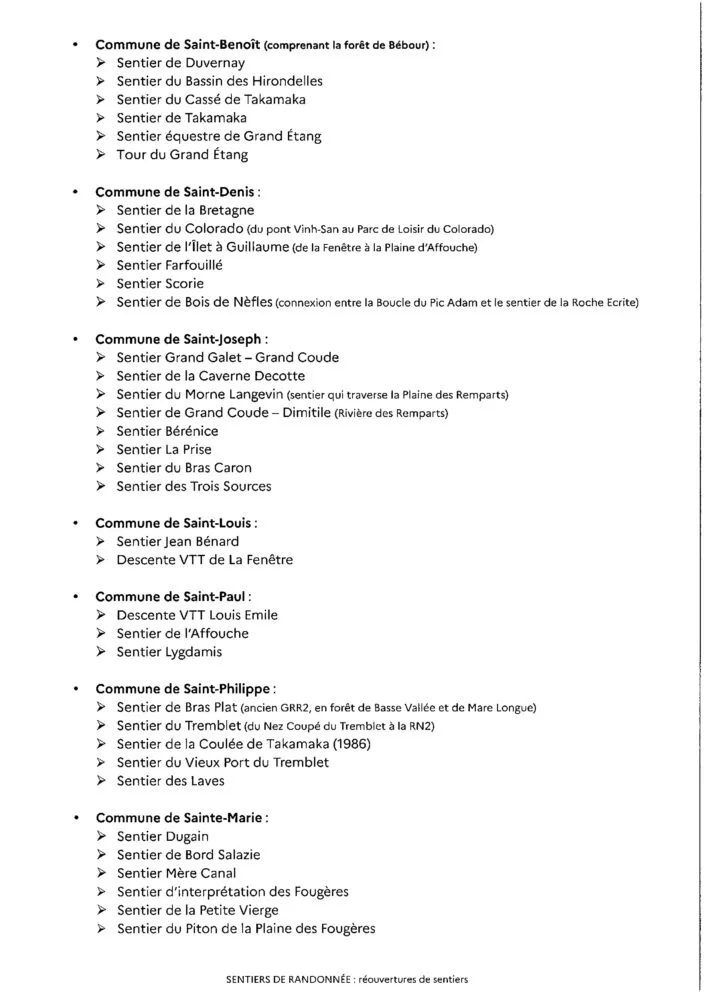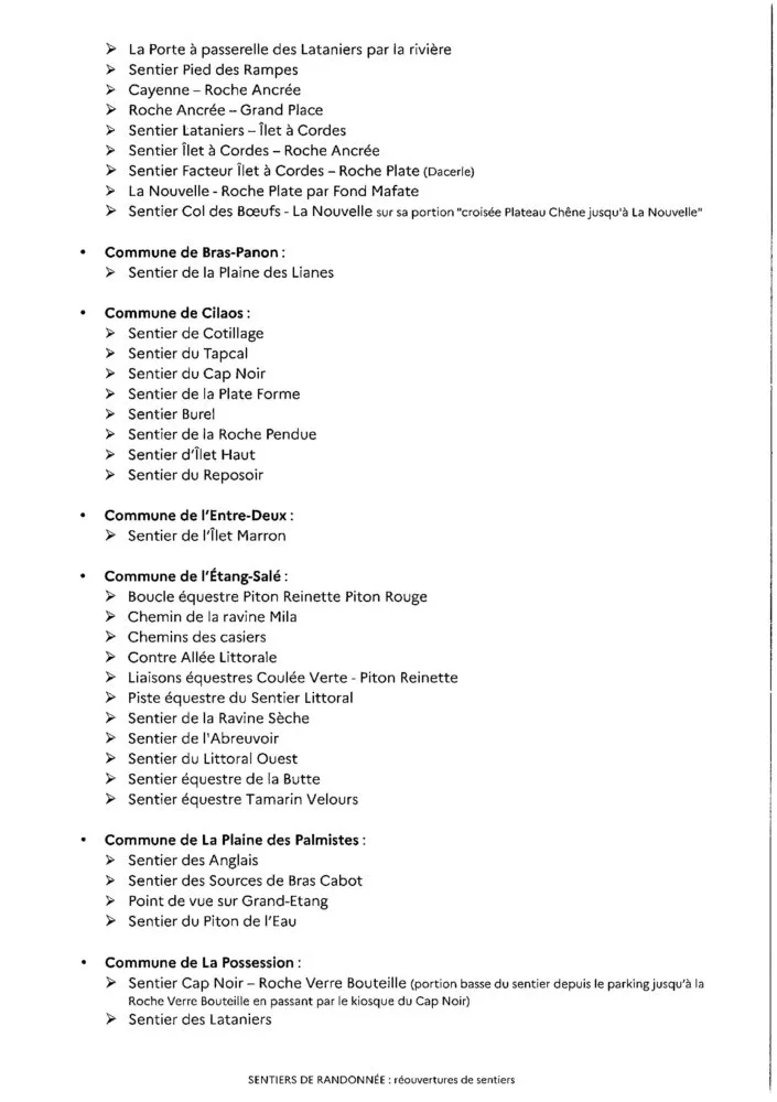 Suite aux travaux réalisés par les équipes de l’ONF, les sentiers Dos d’Âne – Deux Bras, chemin Charrette (cirque de Mafate), du Malbar Mort et de la Pièce Jeanne (commune de Saint-Louis), du Piton Hyacinthe (commune du Tampon) et Plaine des Palmistes – Piton Textor (communes de La Plaine des Palmistes et du Tampon) peuvent être rouverts.