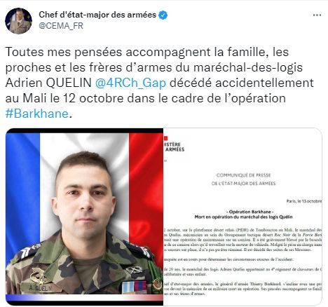 Le chef d’Etat major des armées a annoncé ce mercredi matin le décès d’un soldat français, Adrien Quélin, 29 ans, au Mali. Décès survenu hier, lors d’une opération de maintenance sur un camion.
