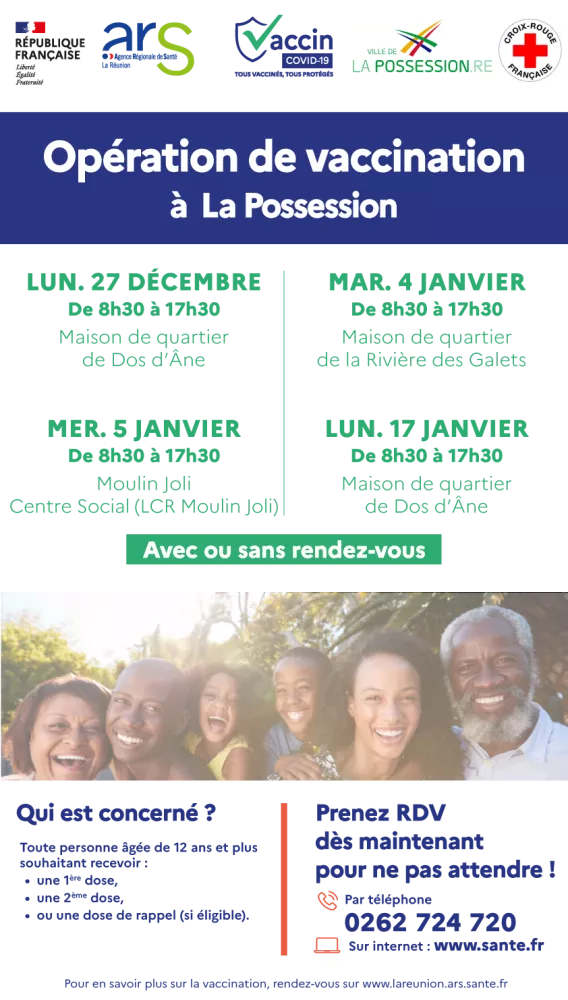 L’ARS, en lien avec la Croix Rouge et la commune de La Possession, a organisé tout ce mois de janvier à la Possession, des opérations de vaccination de proximit. Après les 4, et 5 janvier, la dernière aura lieu le lundi 17 janvier 2022 à la Maison de quartier de Dos d’Âne de 8H30 à 17H30.