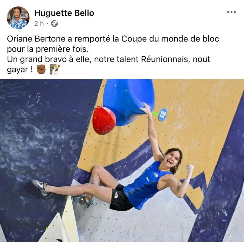 « C’est avec beaucoup de joie que j’adresse mes plus chaleureuses félicitations à Oriane Bertone qui, à seulement 20 ans, vient de remporter la Coupe du monde d’escalade.