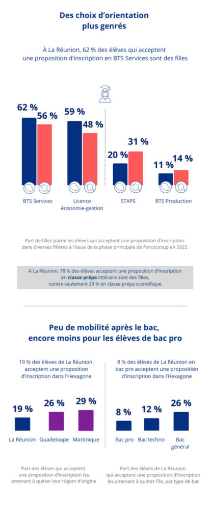 Les élèves de La Réunion souhaitent moins souvent quitter leur région que dans des territoires comparables, c’est-à-dire des régions qui ne disposent pas d’une offre de formation de très grande taille (Antilles, Guyane, Corse, Centre-Val-de-Loire, Bourgogne-Franche-Comté, Normandie). Ce sont surtout les élèves avec un baccalauréat professionnel ou technologique qui partent moins souvent qu’ailleurs. Les élèves de la série générale et ceux issus d’un environnement familial favorisé « sautent la mer » bien plus souvent. Quatre élèves sur cinq acceptent une proposition d’inscription à La Réunion pour leur première année dans le supérieur.