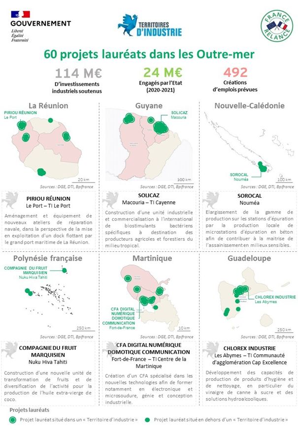 Dans le cadre de la poursuite du déploiement de France Relance, Sébastien Lecornu, ministre des Outre-mer, Jacqueline Gourault, ministre de la Cohésion des territoires et des Relations avec les collectivités territoriales, et Agnès Pannier-Runacher, ministre déléguée chargée de l’Industrie, présentent ce jour les 60 lauréats ultramarins du fonds d’accélération des investissements industriels dans les territoires (voir carte ci-après). Opéré par Bpifrance, ce dispositif repose sur un travail partenarial entre les services de l’Etat, les régions et les collectivités concernées.