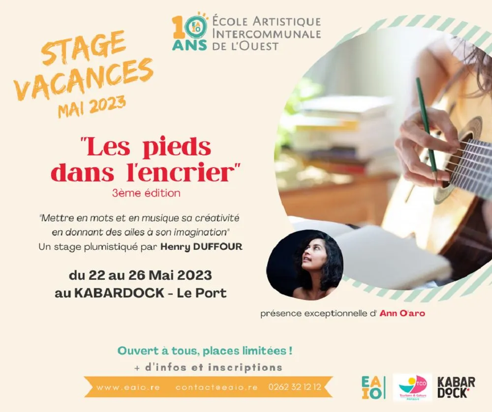 - Du 22 au 26 mai 2023, au Kabardock au Port, Henry DUFFOUR, vous invite à mettre en mots et en musique votre créativité en donnant des ailes à votre imagination lors de la 3ème édition des « Pieds dans l’encrier ». Une présence exceptionnelle d’ANN O’ARO sur ce stage.