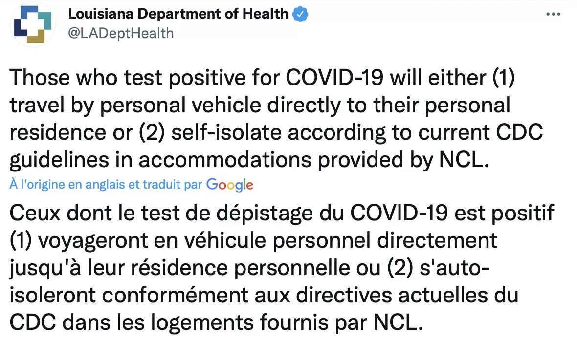 Louisiana Department of Health a déclaré que toutes les personnes à bord vont être soumise à un test COVID avant de débarquer.