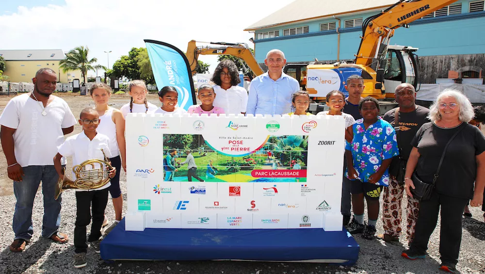 Joé Bédier a posé la première pierre du Parc Lacaussade, hier, mercredi 23 mars 2022, en présence des représentants de l’Etat, de la Cirest, des élus de la ville ainsi que de nombreux habitants via les associations et les écoles, notamment celles de danse et de musique. La pose de la première pierre du Parc Lacaussade marque le début des chantiers NPNRU pour 2022 et la création du premier poumon vert du centre-ville.