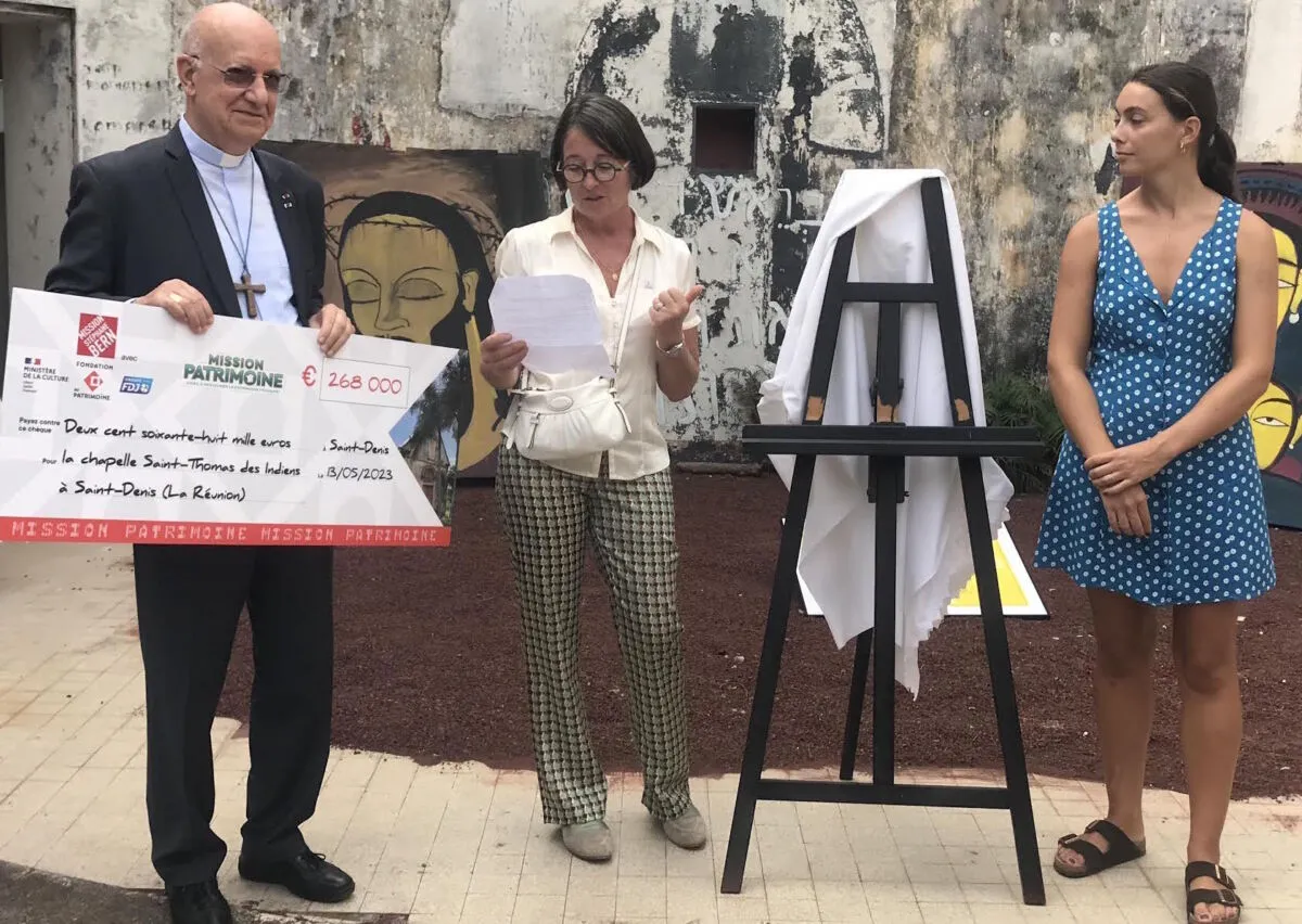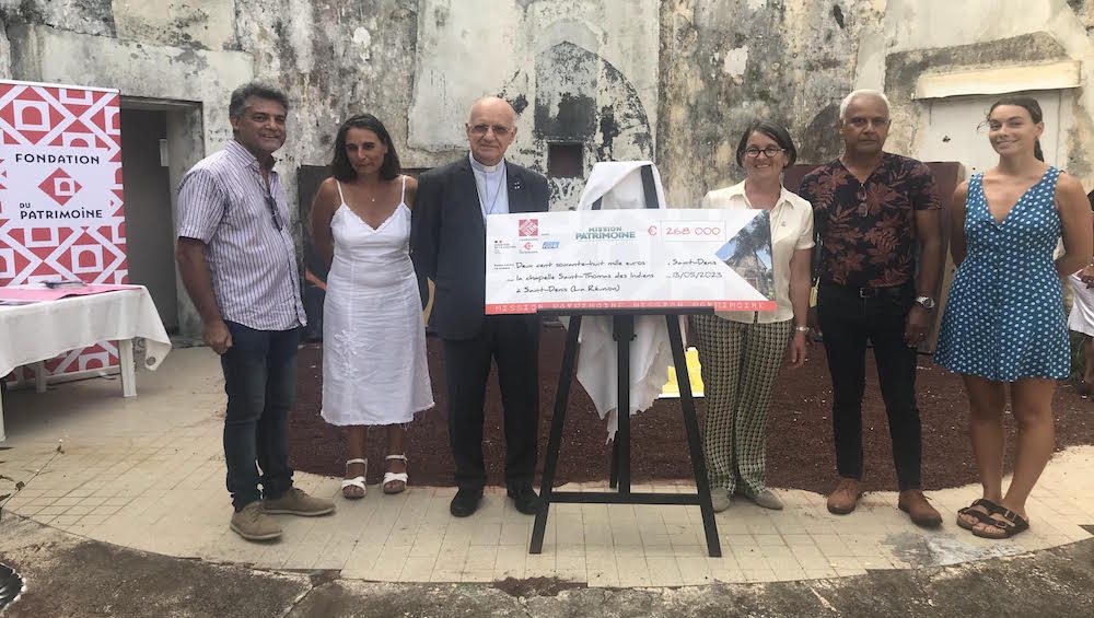 « Ti pas, ti pas na arrivé », selon une expression créole bien connue. En tout cas, c’est dans ce sens que travaillent les Amis de la Chapelle Saint Thomas des Indiens située au 55, rue Monseigneur de Beaumont à Saint-Denis (de La Réunion). Le samedi 13 mai dernier, Mme Monique Ozoux, déléguée régionale de la Fondation du Patrimoine a remis un chèque de 268 000 € à l’évêque de la Réunion, Mgr Gilbert Aubry.