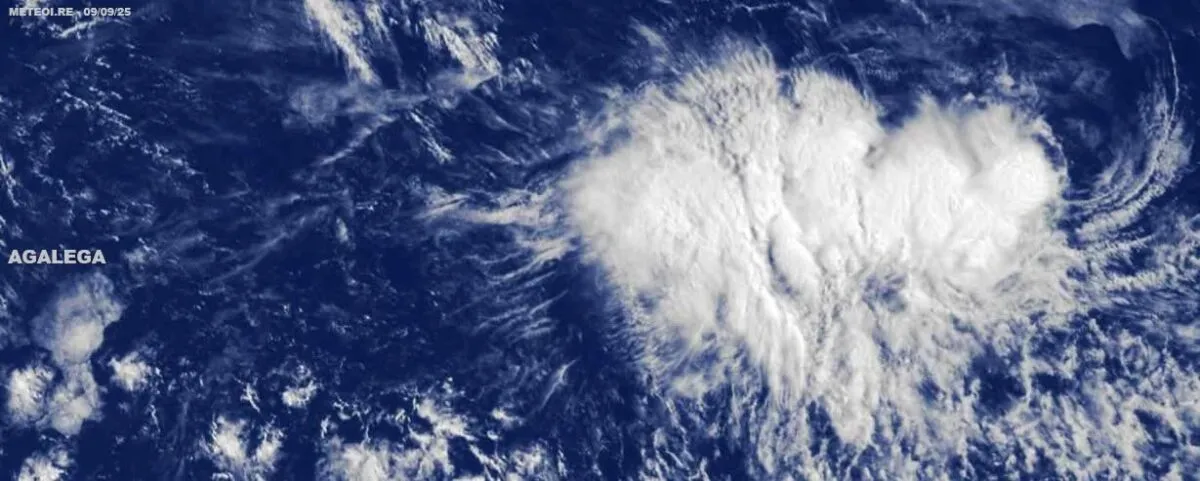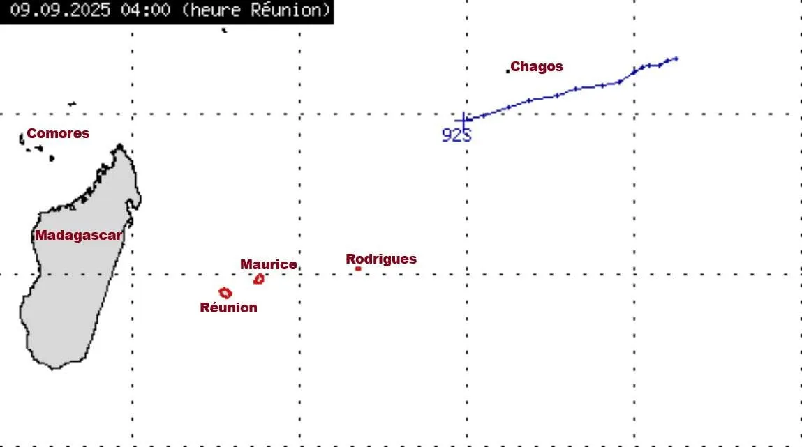 Ce lundi matin, le centre du phénomène était localisé par 9.2° Sud / 69.8° Est, soit environ 1 750 km au nord-est de l’île Maurice et 1 450 km à l’est d’Agalega. Il se déplaçait vers l’ouest-sud-ouest à plus de 20 km/h. La pression minimale est estimée à moins de 1005 hPa, avec des rafales proches de 80 km/h autour du centre.