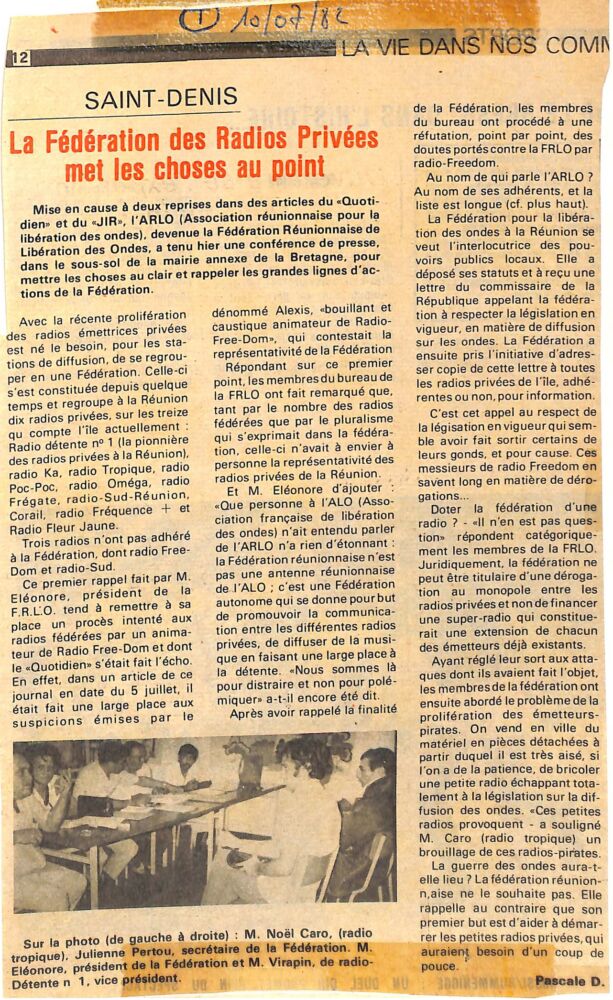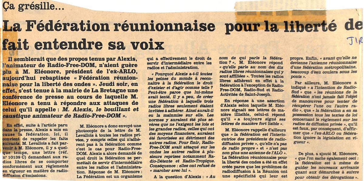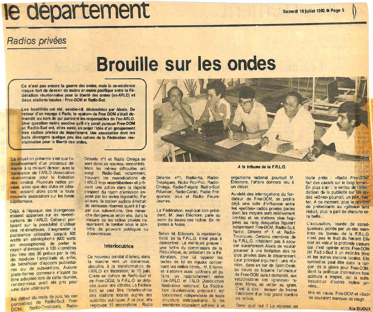 1982 Petite guéguerre entre radios libres par La Rédaction 5 juillet 1982 1 min de lecture L’occasion de revenir sur des radios libres de l’époque aujourd’hui disparues comme par exemple : Radio Tropiques, Radio Détente N°1, Radio Oméga, Radio Ka, Radio Poc Poc, Radio Frégate, Radio Corail, Radio Fleurs Jaunes… Ne manquez pas toute l’actualité de La Réunion ! Abonnez-vous à la newsletter de Free Dom ! Valider Partager Facebook Twitter Pinterest Linkedin Whatsapp Reddit Email Vous pourriez être intéressé par 10 décembre 1982 Un canular par jour sur Radio Free Dom 11 octobre 1982 L’émission « pas de canard sans navet » 7 octobre 1982 L’émission « bleu outre-mer ou la radio de la méduse… » La Rédaction Laisser un commentaire Annuler la réponseYour email address will not be published. Enregistrer mon nom, mon e-mail et mon site dans le navigateur pour mon prochain commentaire. Current ye@r * Leave this field empty Article précédent Enfin le premier réémetteur dans l’Est ! Article suivant Radio Free Dom a 1 an ! Articles récents... Hommage à Johnny Hallyday sur Free Dom 2 ce 5 décembre Mardi 30 décembre 2025 – Météo, éphéméride et horoscope du jour Saint-Joseph : découverte de 2337 plants de cannabis, arrestation de 2 individus Point sur le réseau routier départemental, 29 décembre à 16H30 Suicide sur le pont de la Rivière d’Abord : importante mobilisation des secours et des forces de l’ordre Radier submergé à Ilet Furcy : la route de Cilaos fermée à la circulation cette nuit Fortes pluies : appel à la plus grande prudence à Saint-Paul Saint-Gilles-les-Bains : une route impraticable, les riverains montent au créneau (VIDEOS) Très grands excès de vitesse : un délit passible de prison depuis le 29 décembre 2025 Fermeture temporaire du sentier de la Canalisation des Orangers (cirque de Mafate)
