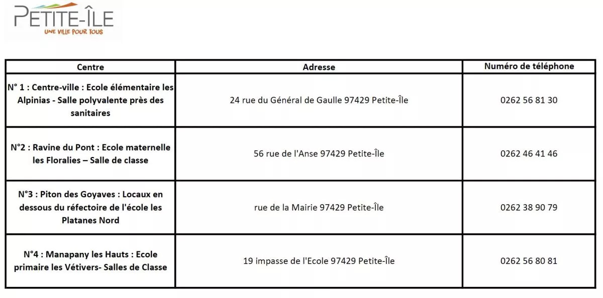 4 centres sont mis en place. Le numéro d’urgence de la commune est le 02 62 57 50 49