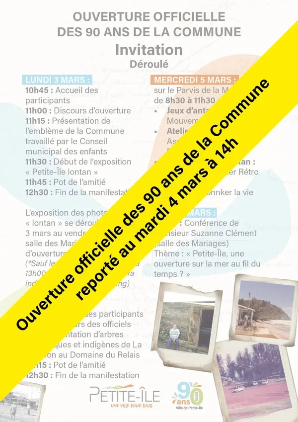 L’ouverture officielle des célébrations des 90 ans de la Commune de Petite-Île, prévue initialement ce lundi a été reportée au mardi 4 mars 2025 à 14h à la Mairie. Ce changement de date fait suite au passage du cyclone Garance, qui a perturbé les activités de la région.