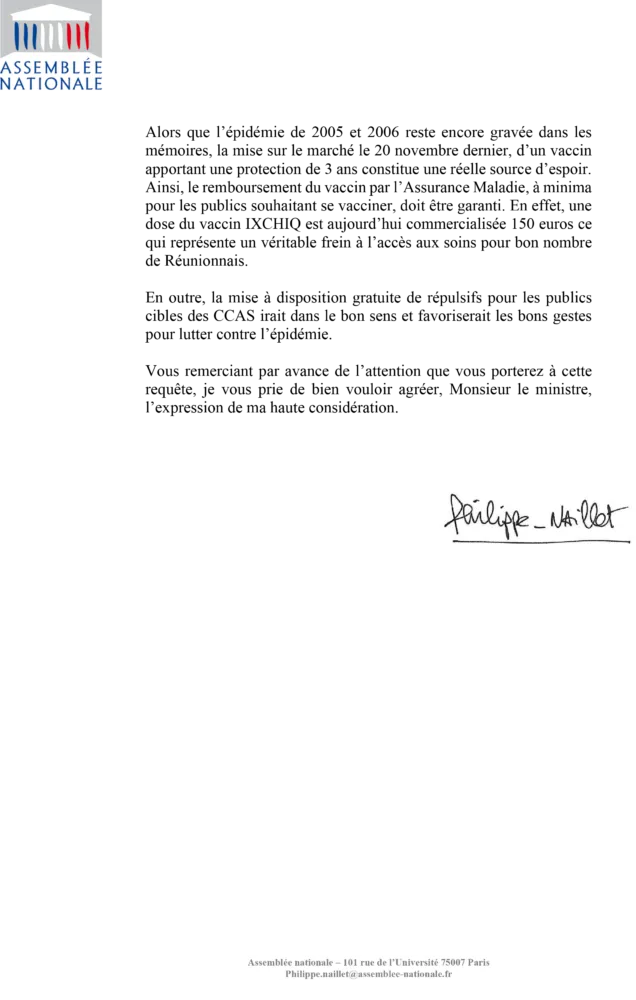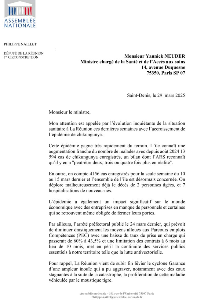Le député Philippe Naillet a adressé ce jour un courrier au ministre de la Santé afin de l’alerter sur la situation préoccupante liée à l’épidémie de chikungunya qui touche actuellement La Réunion.