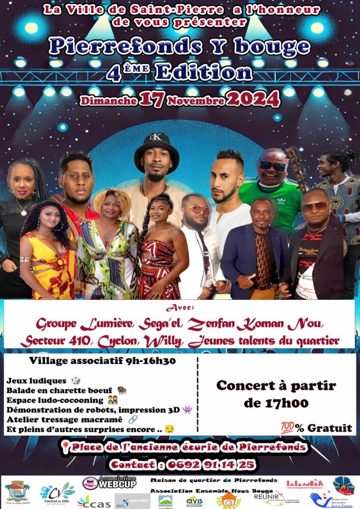 La fête se poursuivra en musique à partir de 17h, avec des concerts qui animeront la soirée. Des groupes tels que L’umière, Segnel, Z’enfan Koman Nou, Secteur 410, Cyclon et Willeg mettront l’ambiance, et les jeunes talents du quartier de Pierrefonds se produiront également sur scène.