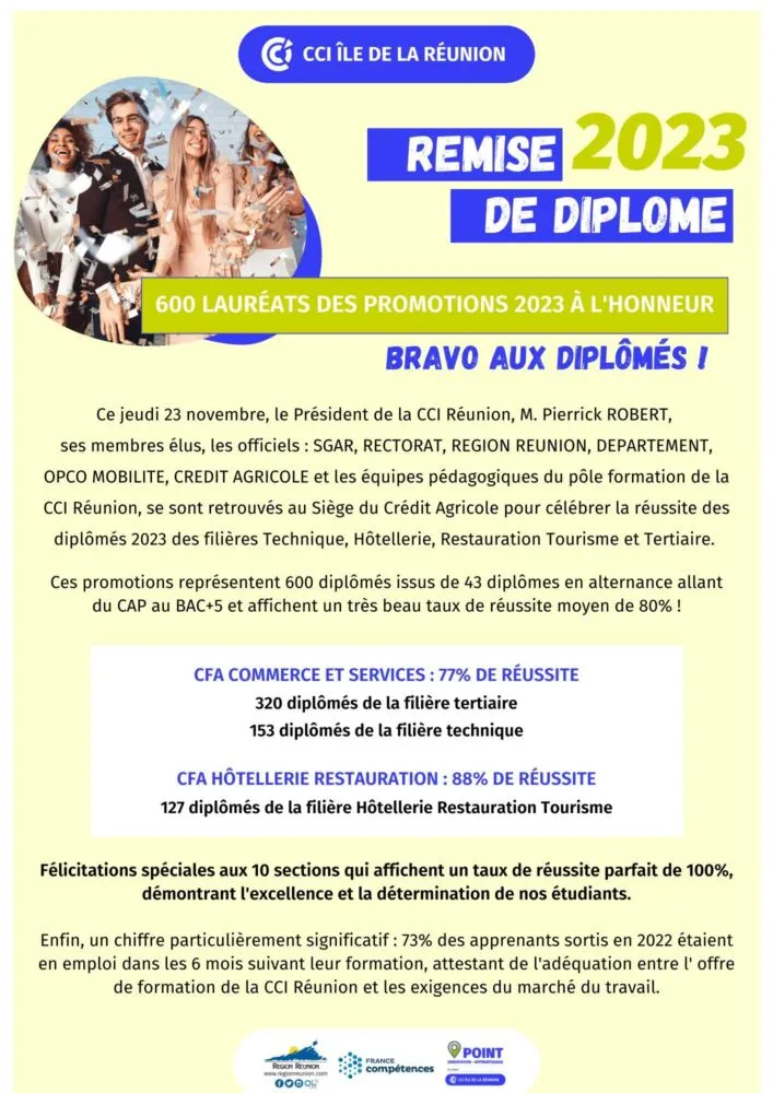 Actualités/CCIR/Collectivités Pierrick ROBERT honore les Lauréats 2023 : Cérémonie de remise de diplômes ce 23 novembre (Photos-Vidéo) par Céline Hardelain 27 novembre 2023 1 min de lecture 12 Ce 23 novembre, Pierrick ROBERT, Président de la Chambre de Commerce et d’Industrie de La Réunion, a présidé la cérémonie de remise des diplômes des lauréats 2023 des CFA Hôtellerie Restauration Tourisme et CFA Commerce/Services/Industrie/BTP. Ne manquez pas toute l’actualité de La Réunion ! Abonnez-vous à la newsletter de Free Dom ! Valider Partager Facebook Twitter Pinterest Linkedin Whatsapp Reddit Email Vous pourriez être intéressé par 31 décembre 2025 Mercredi 31 décembre 2025 – Météo, éphéméride et horoscope du jour 30 décembre 2025 Mardi 30 décembre 2025 – Météo, éphéméride et horoscope du jour 29 décembre 2025 Saint-Joseph : découverte de 2337 plants de cannabis, arrestation de 2 individus Céline Hardelain 12 Commentaires Félicitations aux lauréats pour leur réussite ! Répondre Signaler un commentaire Félicitations aux lauréats… Répondre Signaler un commentaire Félicitations aux lauréats… Répondre Signaler un commentaire Félicitations aux lauréats… Répondre Signaler un commentaire Félicitations aux lauréats… Répondre Signaler un commentaire Félicitations aux lauréats… Répondre Signaler un commentaire Félicitations aux lauréats… Répondre Signaler un commentaire Félicitations aux lauréats… Répondre Signaler un commentaire Félicitations aux lauréats… Répondre Signaler un commentaire Félicitations aux lauréats… Répondre Signaler un commentaire Félicitations aux lauréats… Répondre Signaler un commentaire Félicitations aux lauréats… Répondre Signaler un commentaire Laisser un commentaire Annuler la réponseYour email address will not be published. Enregistrer mon nom, mon e-mail et mon site dans le navigateur pour mon prochain commentaire. Current ye@r * Leave this field empty Article précédent Plaine-des-Palmistes : Johnny Payet inaugure la médiathèque Paulette Pégou Article suivant St-Joseph : Angle de vue, angle de vie, au terrain multisports du Butor Articles récents... Mercredi 31 décembre 2025 – Météo, éphéméride et horoscope du jour Hommage à Johnny Hallyday sur Free Dom 2 ce 5 décembre Mardi 30 décembre 2025 – Météo, éphéméride et horoscope du jour Saint-Joseph : découverte de 2337 plants de cannabis, arrestation de 2 individus Point sur le réseau routier départemental, 29 décembre à 16H30 Suicide sur le pont de la Rivière d’Abord : importante mobilisation des secours et des forces de l’ordre Radier submergé à Ilet Furcy : la route de Cilaos fermée à la circulation cette nuit Fortes pluies : appel à la plus grande prudence à Saint-Paul Saint-Gilles-les-Bains : une route impraticable, les riverains montent au créneau (VIDEOS) Très grands excès de vitesse : un délit passible de prison depuis le 29 décembre 2025