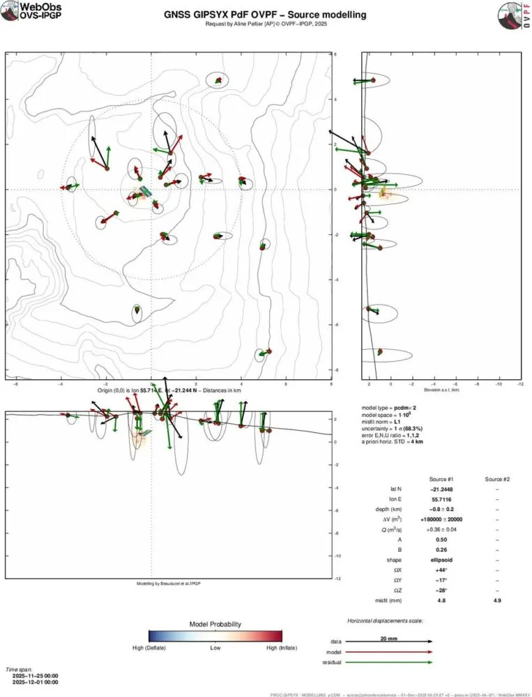 Les stations de déformation confirment cette évolution : après plus d’un an de dégonflement du massif, les mesures GNSS enregistrent un retour à l’inflation fin novembre, indiquant une pressurisation localisée autour de 2,5 km sous le sommet. Ce signal est cohérent avec une remontée de magma vers les réservoirs superficiels.