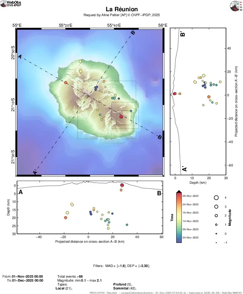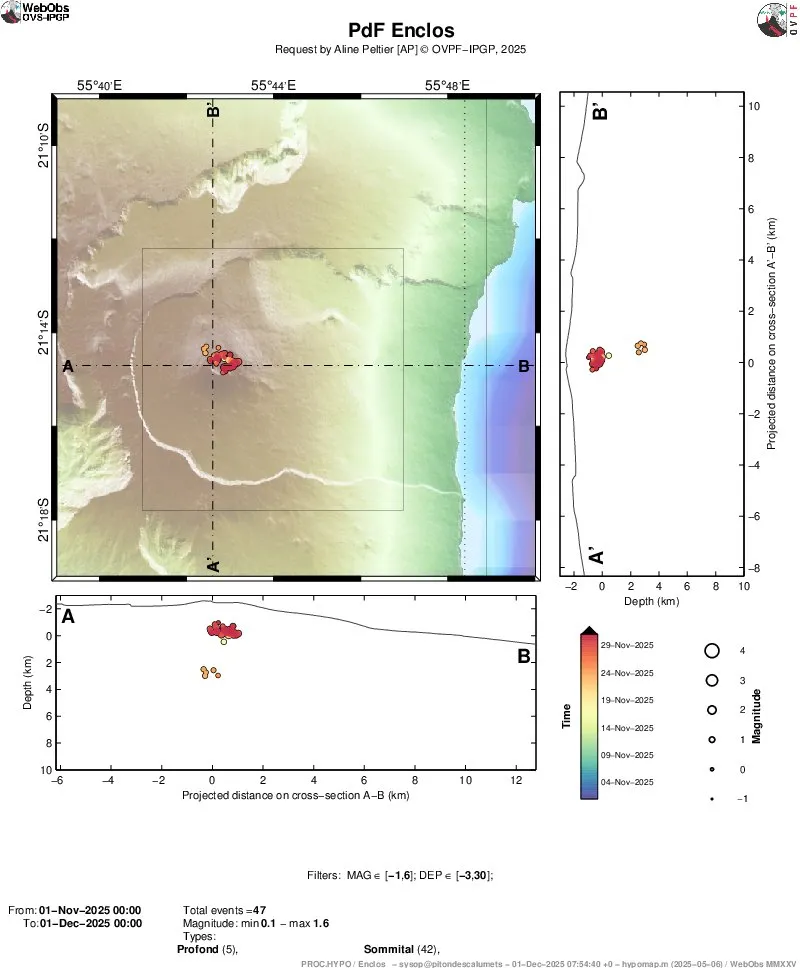 Le bulletin mensuel de l’Observatoire volcanologique du Piton de la Fournaise (OVPF-IPGP) confirme une reprise marquée de l’activité sous la zone sommitale au mois de novembre. Après une longue période de calme, 350 séismes superficiels ont été détectés sous les cratères, accompagnés de 24 séismes plus profonds et de 26 signaux longue-période, révélateurs de mouvements de fluides en profondeur.