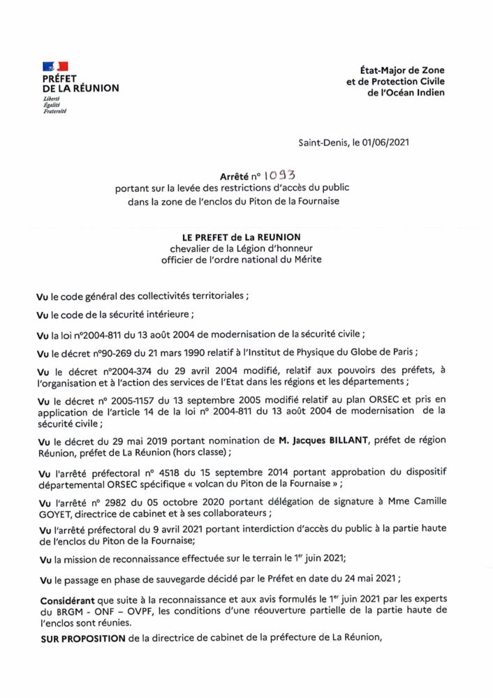 Suite aux constatations de l’Observatoire volcanologique du Piton de la Fournaise (OVPF), lors de la reconnaissance effectuée le 1er juin 2021 avec le Bureau de Recherches Géologiques et Minières (BRGM), l’Office national des forêts (ONF) et le peloton de gendarmerie de haute montagne (PGHM), le préfet de La Réunion a décidé de revenir en phase de vigilance conformément au dispositif spécifique ORSEC* du Volcan du Piton de la Fournaise et ce à compter de ce jeudi 3 juin.