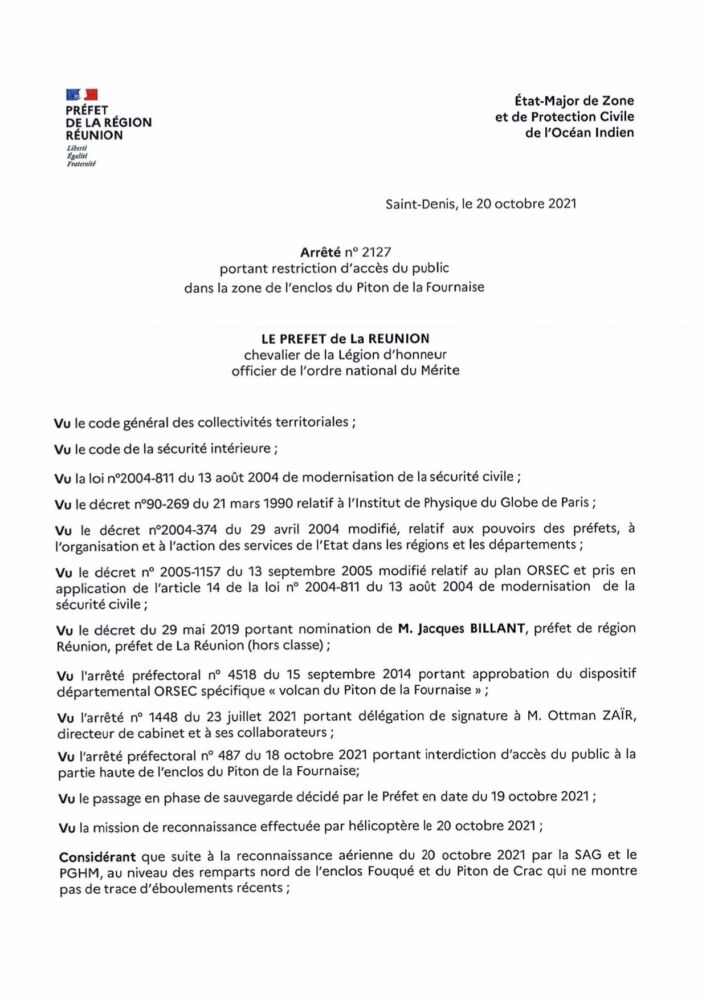 Suite aux constatations de l’Observatoire Volcanologique du Piton de la Fournaise (OPVF) lors de la reconnaissance menée le 20 octobre par le PGHM* et SAG*, le préfet de La Réunion a décidé de revenir en phase de vigilance du dispositif spécifique ORSEC volcan et ce à compter du jeudi 21 octobre. Néanmoins un risque de de reprise de l’activité volcanique n’est pas exclure à moyen terme car une inflation de l’édifice volcanique montre une mise en pression du réservoir magmatique superficiel.