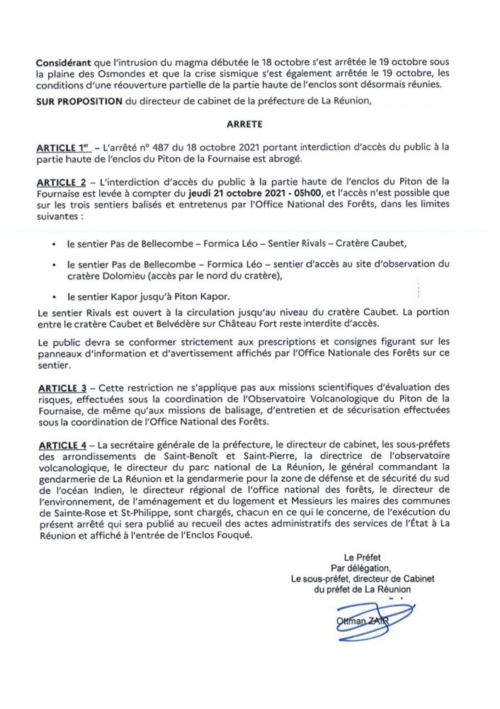 L’interdiction d’accès du public à la partie haute de l’enclos du Piton de la Fournaise est levée à compter du jeudi 21 octobre à 5h00.