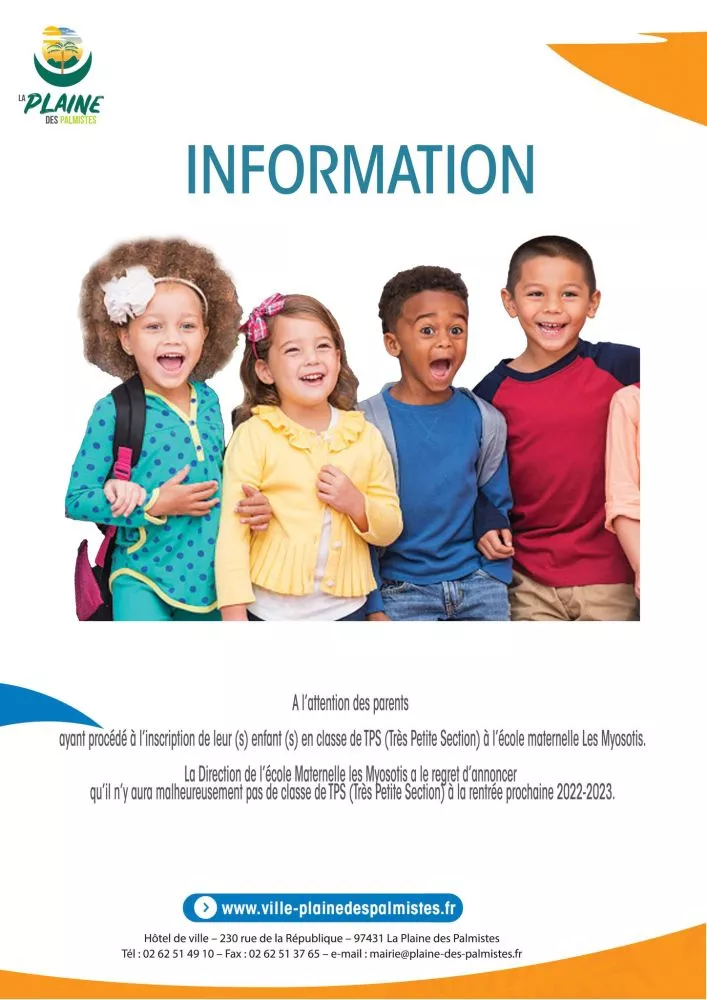 Non classé Plaine des Palmistes : école Maternelle les Myosotis, pas de classe de Très Petite Section à la rentrée 2022-2023 par La rédaction F R 7 juillet 2022 1 min de lecture La Direction de l’école Maternelle les Myosotis a le regret d’annoncer qu’il n’y aura malheureusement pas de classe de TPS (Très Petite Section) à la rentrée prochaine 2022-2023. Ne manquez pas toute l’actualité de La Réunion ! Abonnez-vous à la newsletter de Free Dom ! Valider Partager Facebook Twitter Pinterest Linkedin Whatsapp Reddit Email Vous pourriez être intéressé par 25 décembre 2025 Mais qui à remplacé notre voile d’avant ? 23 décembre 2025 Le Port : carambolage impliquant plusieurs voitures à la ZAC 2000 17 décembre 2025 Travaux de fauchage sur la RN6 à Saint-Denis : circulation interrompue mercredi soir La rédaction F R Laisser un commentaire Annuler la réponseYour email address will not be published. Enregistrer mon nom, mon e-mail et mon site dans le navigateur pour mon prochain commentaire. Current ye@r * Leave this field empty Article précédent Un Village de l’Emploi ce jeudi 7 juillet au Port jusqu’à 14h Article suivant Bras-Panon : découvrez l’ensemble des manifestations programmées ce week-end Articles récents... Mercredi 31 décembre 2025 – Météo, éphéméride et horoscope du jour Hommage à Johnny Hallyday sur Free Dom 2 ce 5 décembre Mardi 30 décembre 2025 – Météo, éphéméride et horoscope du jour Saint-Joseph : découverte de 2337 plants de cannabis, arrestation de 2 individus Point sur le réseau routier départemental, 29 décembre à 16H30 Suicide sur le pont de la Rivière d’Abord : importante mobilisation des secours et des forces de l’ordre Radier submergé à Ilet Furcy : la route de Cilaos fermée à la circulation cette nuit Fortes pluies : appel à la plus grande prudence à Saint-Paul Saint-Gilles-les-Bains : une route impraticable, les riverains montent au créneau (VIDEOS) Très grands excès de vitesse : un délit passible de prison depuis le 29 décembre 2025