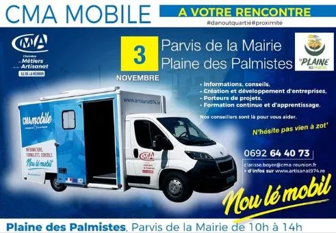 L’équipe mobile de la Chambre de métiers et de l’Artisanat Réunion (CMA) ont le plaisir de venir retrouver les habitants de la plaine des Palmistes pour les aider. Les conseillers seront présents afin d’offrir des informations, conseils, créer et accroître des entreprises, aider les personnes porteuses de projets à les développer. Ils seront également présents pour vous partager les formations continues et apprentissage qu’ils possèdent. Rendez-vous donc, le jeudi 3 novembre sur le parvis de la mairie à la plaine des Palmistes de 10 h à 14 h.