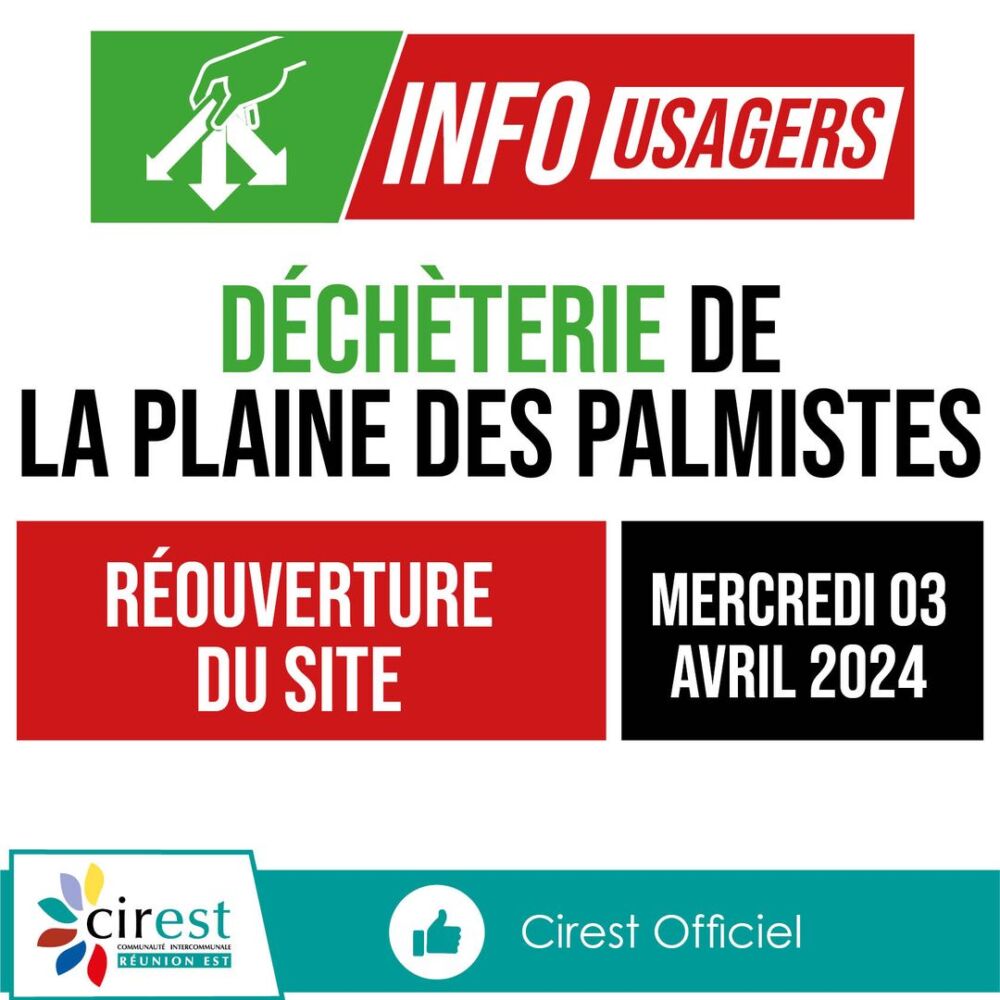 La Cirest vous annonce que la déchèterie de La Plaine des Palmistes sera fermée pour des raisons de déménagement le 03 avril 2024.