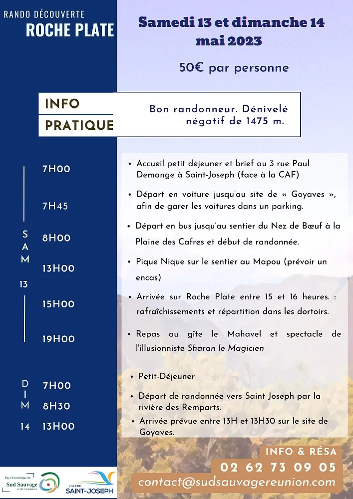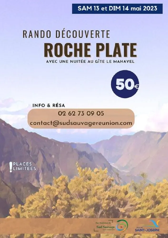 La Région Touristique Sauvage du Sud organise une randonnée découverte de Roche Plate, qui comprend une nuit au gîte Le Mahavel sur Samedi 13 et dimanche 14 mai 2023. Si vous êtes un passionné de randonnée, vous allez adorer cette excursion. N’hésitez donc pas à les rejoindre dans cette découvertes des paysages à couper le souffle et vues de Roche Plate. Plongez dans la beauté de la nature et découvrez la tranquillité des montagnes.