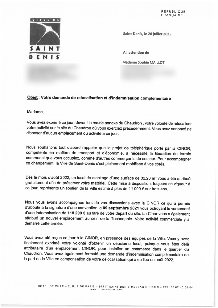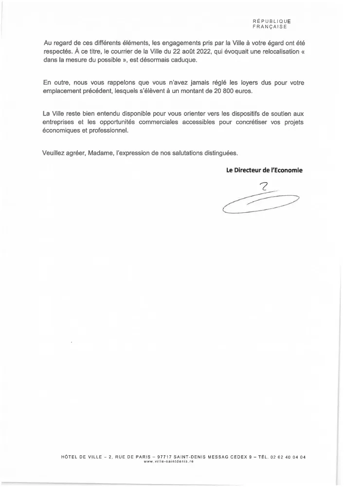 La Ville de Saint-Denis rappelle que l’ensemble des engagements pris à son égard ont été respectés, et que le courrier datant de 2022, rédigé dans le cadre d’un processus de discussion engagé avec Madame Maillot évoquant une relocalisation « dans la mesure du possible », n’est désormais plus applicable. La Ville rappelle également que les loyers de son ancien local, d’un montant de 20 800€, n’ont jamais été réglés.