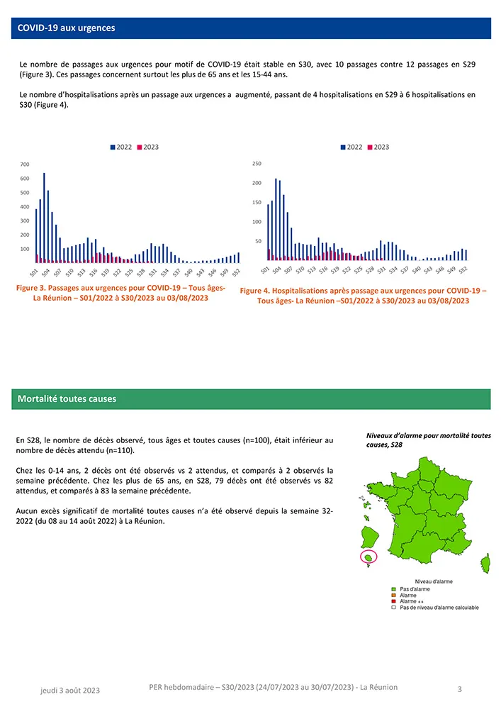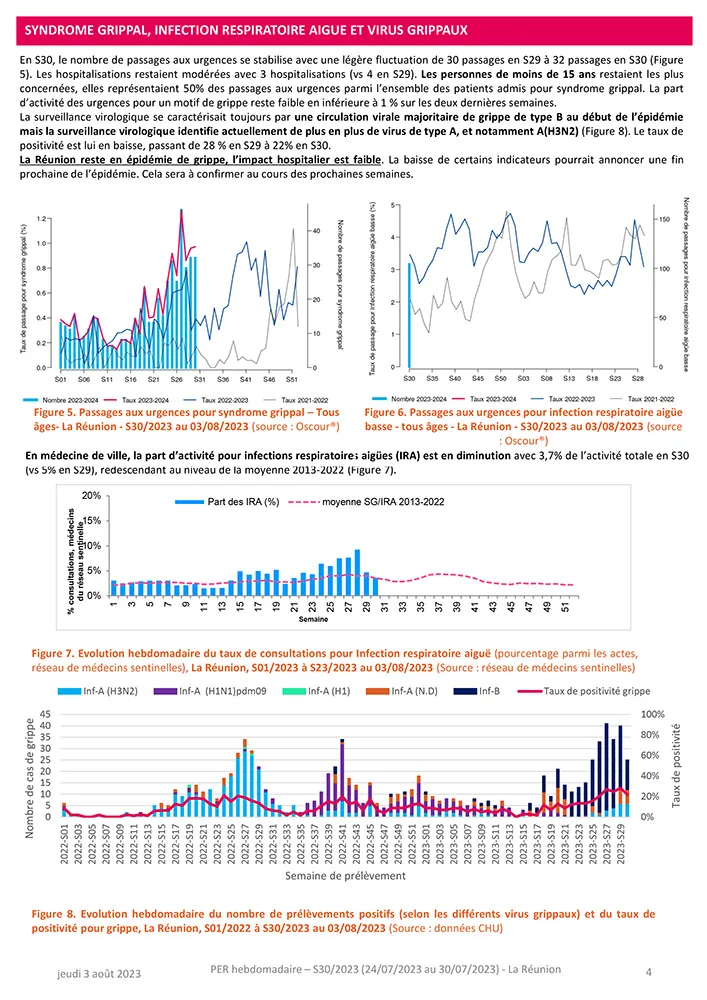 Selon le point épidémiologique régional de la semaine 30 (24 au 30 juillet 2023), une tendance à la baisse de l’épidémie de grippe se confirme avec une diminution du taux de positivité et du nombre de passages aux urgences. Cependant, le nombre d’hospitalisations après un passage aux urgences a augmenté légèrement.