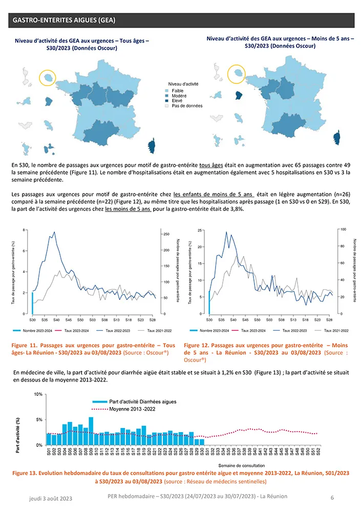 Concernant la gastro-entérite, une augmentation du nombre de passages aux urgences et d’hospitalisations a été observée en S30, notamment chez les enfants de moins de 5 ans.