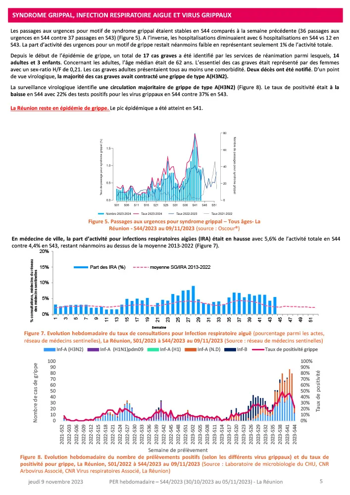 - Grippe : La Réunion reste en épidémie de grippe avec une circulation majoritaire de type A(H3N2) (Stabilité des indicateurs sanitaires et baisse des indicateurs virologiques)