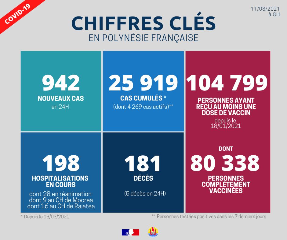 Après les 10 morts recensés, mardi 10 août 2021, le bilan épidémiologique publié mercredi 11 août 2021 par la plateforme Covid-19 Polynésie fait état de 5 nouveaux décès liés au Covid et de 942 nouveaux cas détectés en 24 heures.