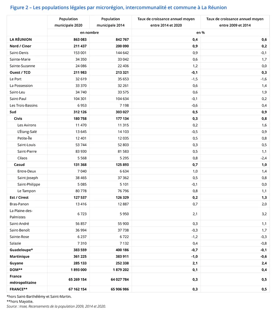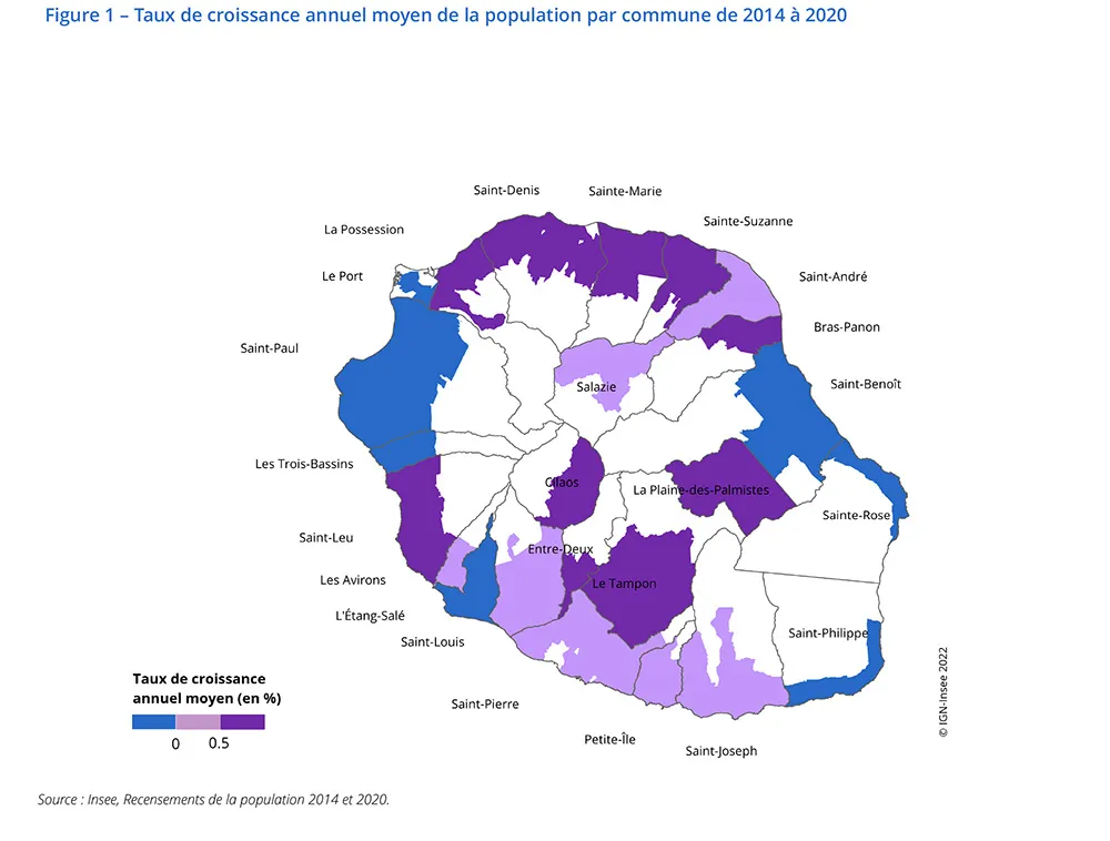 Entre 2014 et 2020, la croissance démographique de l’île se place notamment derrière celle de la Guyane (+ 2,1 %) et de la Corse (+ 1,0 %). De leur côté, les Antilles perdent des habitants (- 1,0 % en Martinique et – 0,7 % en Guadeloupe).