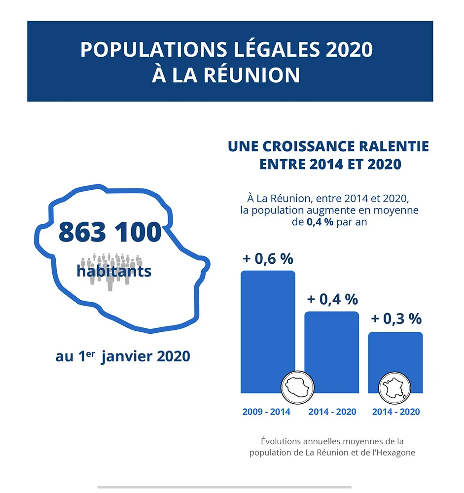 Au 1er janvier 2020, 863 100 personnes résident à La Réunion. La population augmente de 0,4 % en moyenne par an depuis 2014, un peu plus vite que celle de la France métropolitaine (+ 0,3 %). La croissance démographique de l’île est cependant moins forte qu’entre 2009 et 2014. En effet, l’excédent des naissances sur les décès se réduit un peu avec le vieillissement de la population. De plus, sur la période récente, les départs de l’île sont plus nombreux que les arrivées.