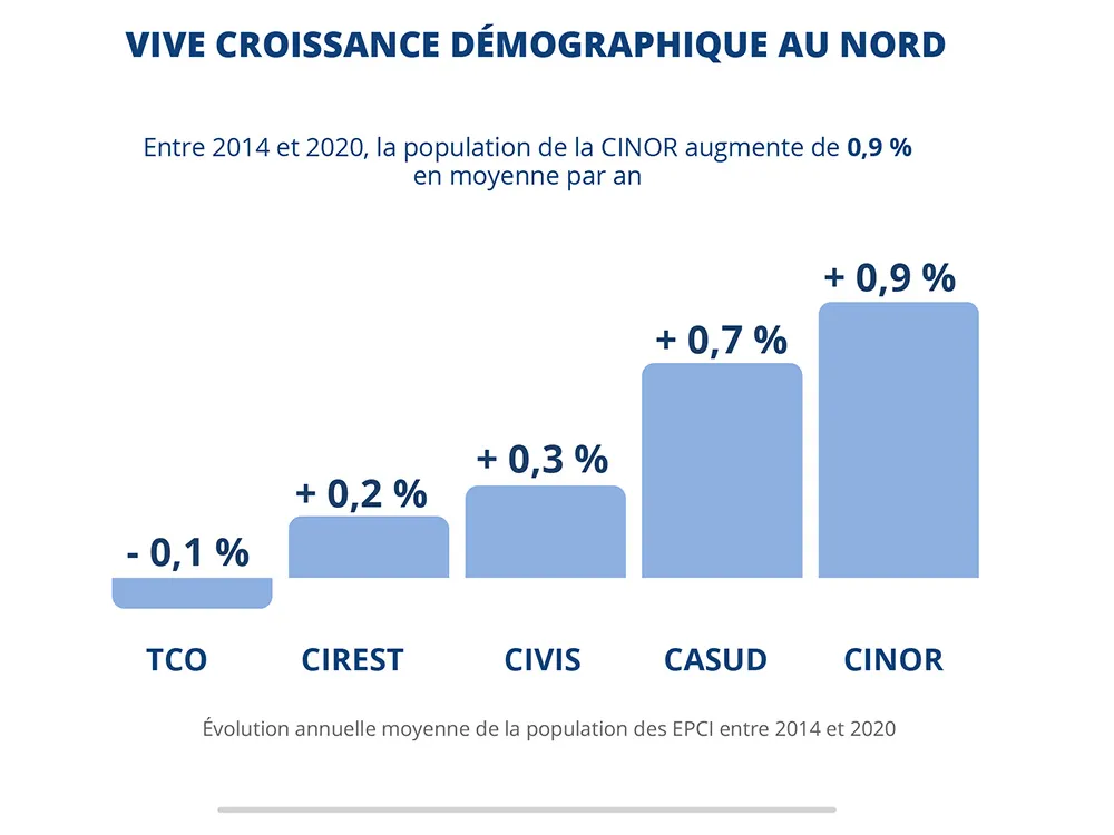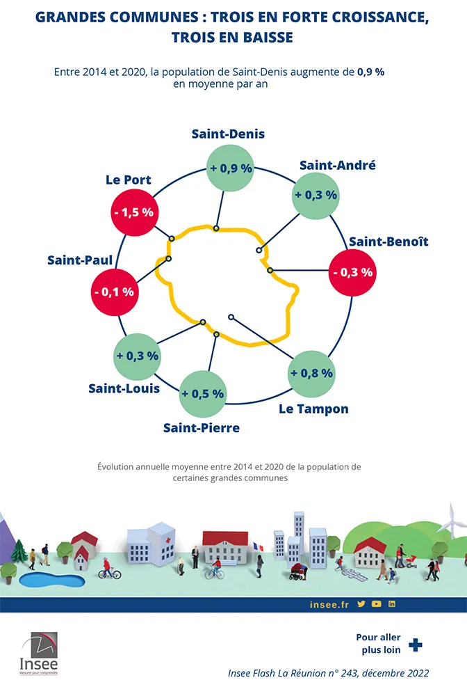 Entre 2014 et 2020, la population croît vivement au Nord. Sa croissance s’infléchit nettement à l’Est, et dans une moindre mesure dans le Sud. À l’Ouest, la population diminue très légèrement. Au sein des grandes villes réunionnaises, la population reste dynamique à Saint-Denis, Saint-Pierre et Le Tampon. Elle baisse en revanche légèrement à Saint-Paul et Saint-Benoît, et fortement au Port.