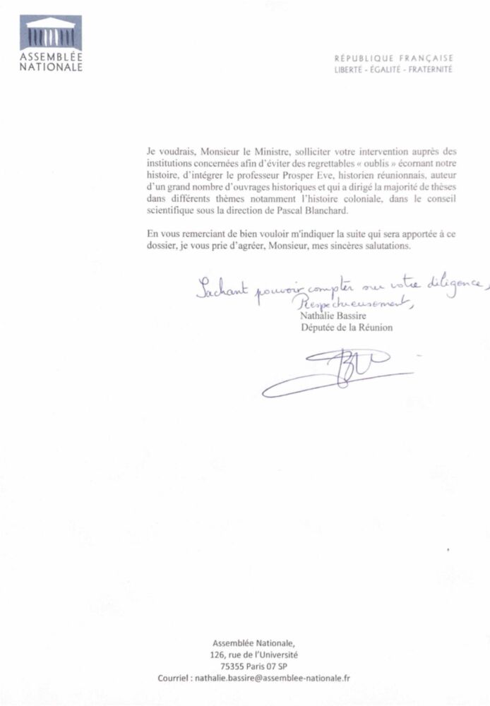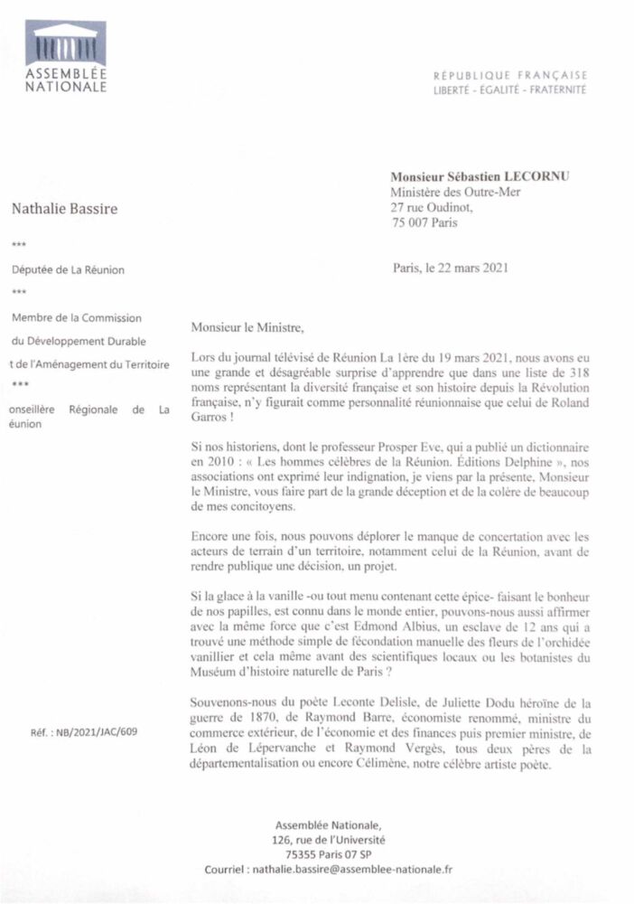 Nathalie Bassire, députée de La Réunion, a interpellé par courrier, la ministre de la culture Roselyne Bachelot Tarquin et le ministre des Outre-mer Monsieur Sébastien Lecornu, à propos du recueil des personnalités marquantes françaises dont le le but est de diversifier le nom des rues et des bâtiments sur le territoire national.