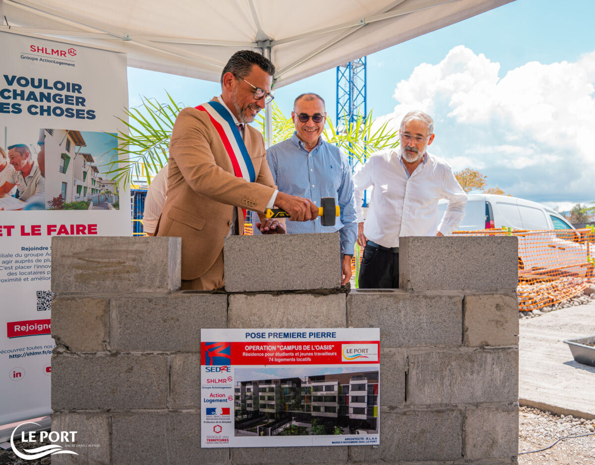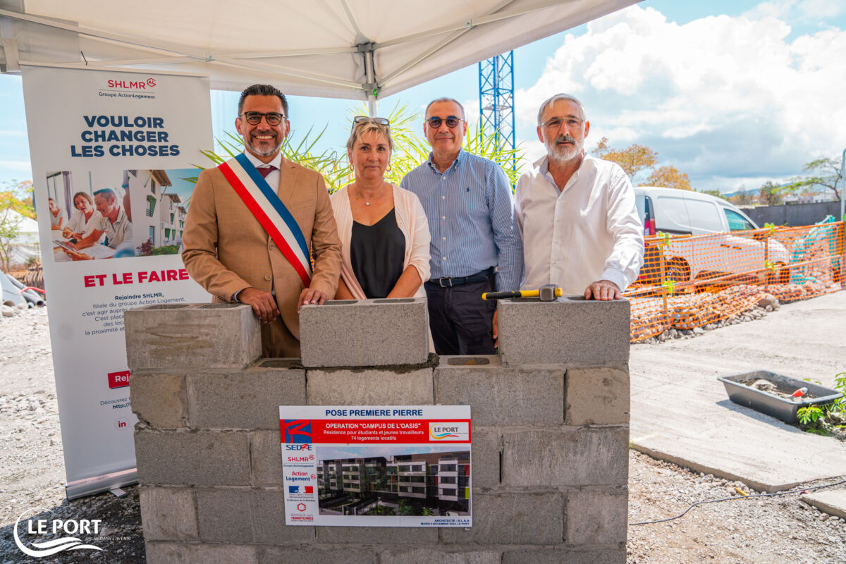 En ce mardi 5 novembre 2024, Olivier Hoarau, Maire du Port, les élus du Conseil Municipal, Yannick Payet Fontaine, Directeur Général de la SEDRE, et Valérie Lenormand, Directrice Générale de la SHLMR, ont procédé à la pose de la pierre de l’opération « Oasis ». Cette dernière, une résidence étudiante et jeunes travailleurs du campus Paul Vergès, s’inscrit dans le périmètre de la ZAC Triangle de l’Oasis qui représente une surface d’environ 5.6 ha.